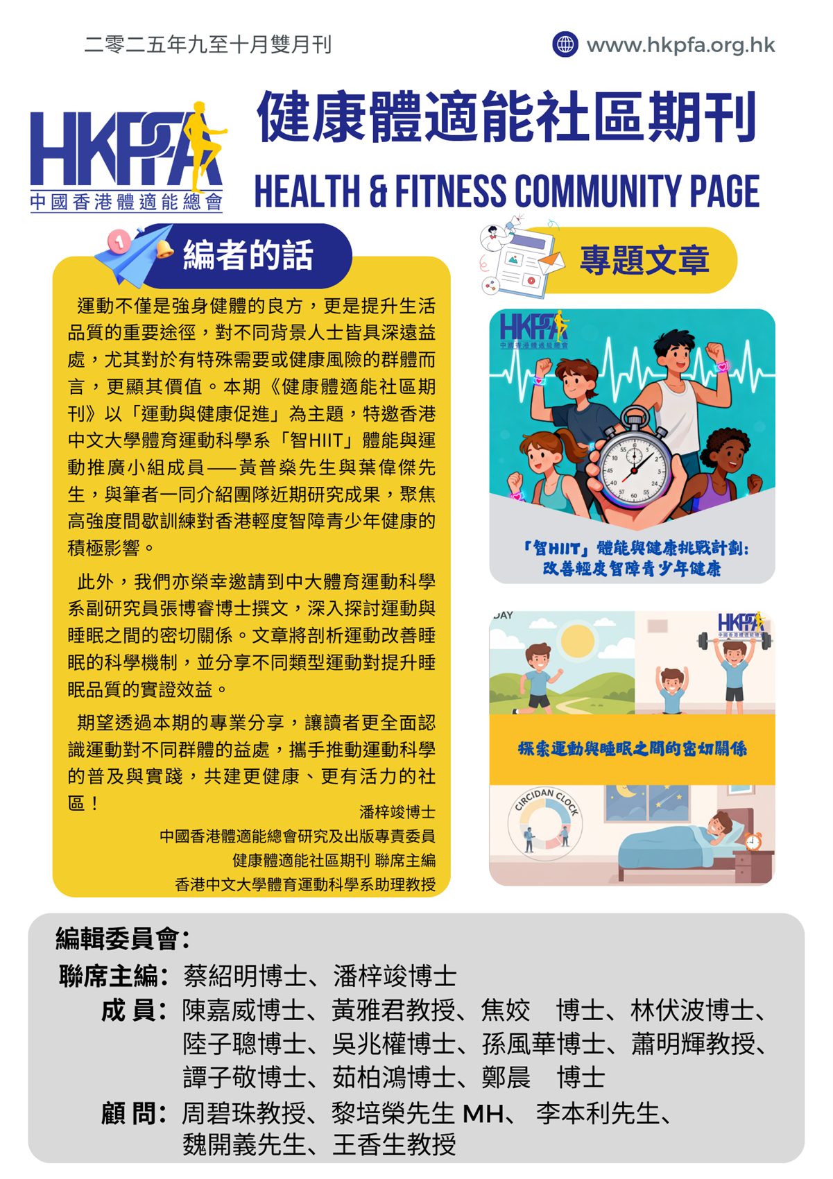 《健康體適能社區期刊》介紹 《健康體適能社區期刊》的宗旨是將時下最新的體適能資訊傳遞給廣大市民,提升健康和生活質量。2024年,期刊將迎來革新,以雙月刊形式每兩個月出版一次。每期將深入淺出地介紹不同的社會熱門主題,包括相關的運動學術研究以及本地不同機構的社區體適能推廣工作。期刊願景是實現「理論與實踐」並重的目標,將科學化且以實證為基礎的體適能知識帶到社區的每個角落。 編輯委員會