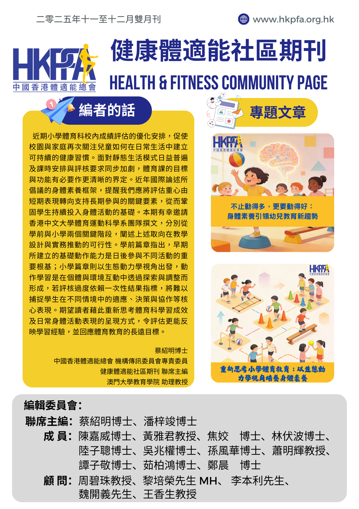 《健康體適能社區期刊》介紹 《健康體適能社區期刊》的宗旨是將時下最新的體適能資訊傳遞給廣大市民,提升健康和生活質量。2024年,期刊將迎來革新,以雙月刊形式每兩個月出版一次。每期將深入淺出地介紹不同的社會熱門主題,包括相關的運動學術研究以及本地不同機構的社區體適能推廣工作。期刊願景是實現「理論與實踐」並重的目標,將科學化且以實證為基礎的體適能知識帶到社區的每個角落。 編輯委員會