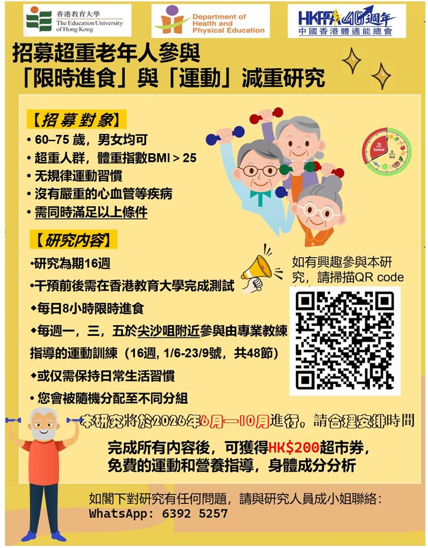 香港教育大學與中國香港體適能總會合辦一項為期16週的健康研究,助您科學減重、改善體能!